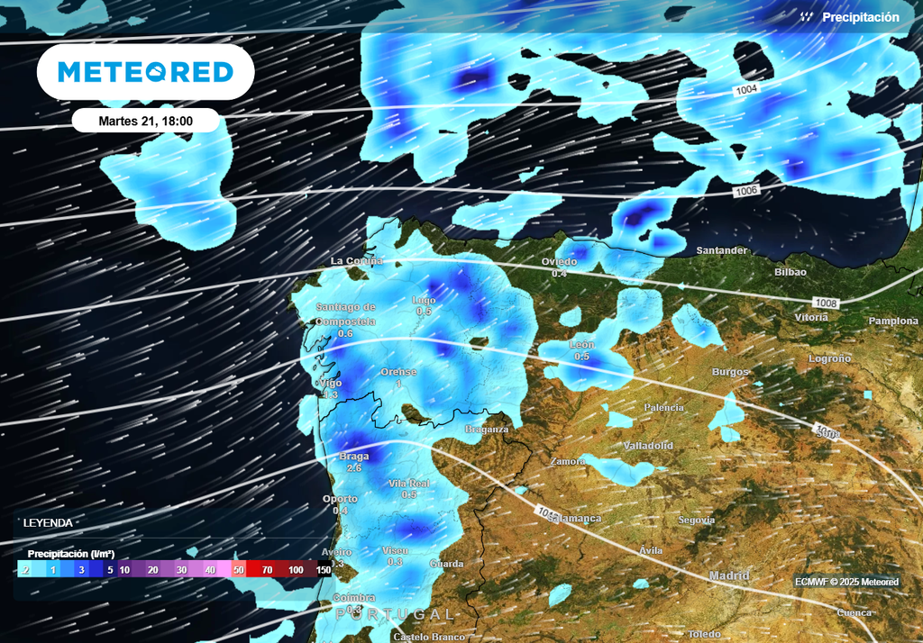 La semana arranca con la lluvia como protagonista en el extremo noroeste de la España peninsular. Según el modelo de referencia de Meteored, irán a más en las próximas horas.