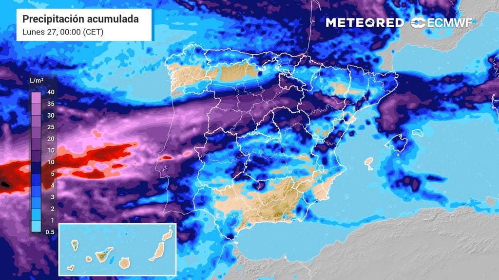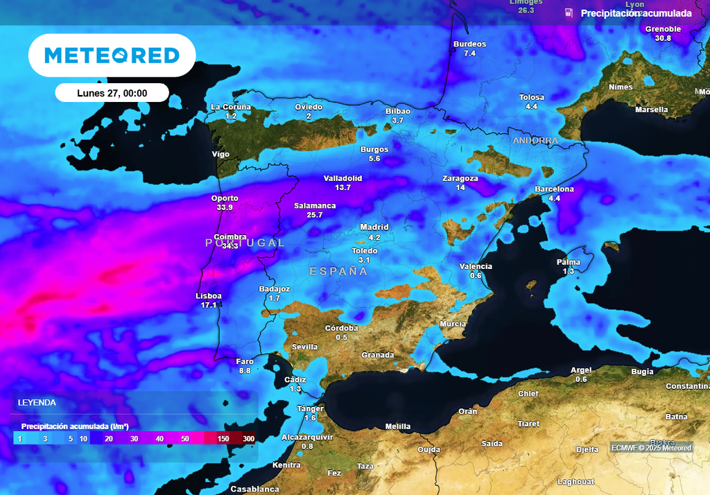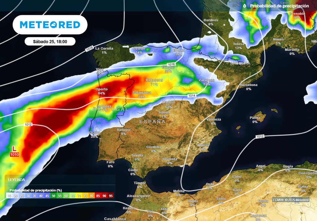 Mañana la combinación del aire subtropical y del paso de una vaguada en altura favorecerá la reactivación de un sistema frontal que se mantendrá estacionario en la mitad norte. Los cielos estarán cubiertos, con nubosidad de tipo medio y alto en el sureste y Baleares. El modelo europeo anticipa precipitaciones ocasionalmente fuertes y con tormenta en el Sistema Central occidental y el Sistema Ibérico norte, registrándose acumulados de más de 40-50 l/m².