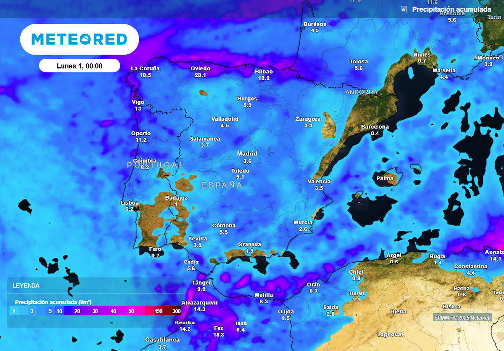 Al final del día, los acumulados superarán los 20 l/m2 en numerosas poblaciones de las Rías Baixas, así como en buena parte de Asturias y en las proximidades de La Pedrosa en Cantabria. Asimismo, la zona más oriental del País Vasco y el noroeste de Navarra podrán registrar más de 20 l/m2 tras una jornada de lluvias persistentes.