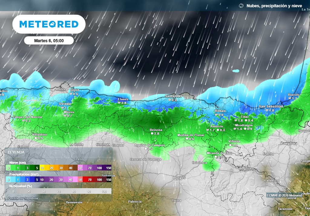 El martes, el episodio de nieve se mantendrá en buena parte del norte y nordeste, con nuevas nevadas en la cordillera Cantábrica de Burgos, León y Palencia, donde volverán a registrarse espesores cercanos a los 5 cm, mientras que en el norte de Burgos los acumulados serán más modestos, en torno a 2 cm