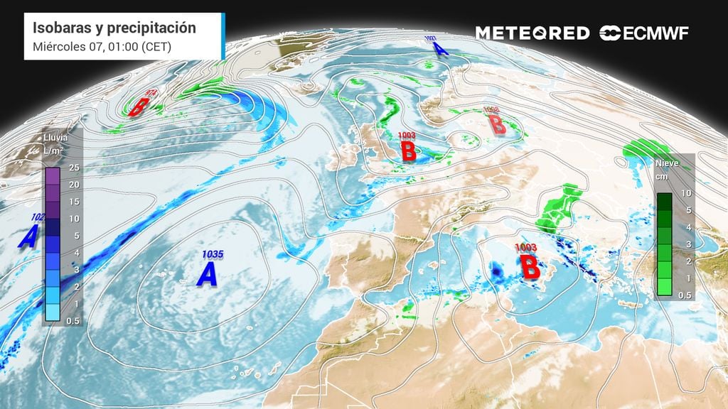 Desde mañana, la llegada de aire ártico al norte de la Península Ibérica generará un fuerte contraste térmico con la temperatura del Cantábrico, creando un entorno muy favorable para este tipo de precipitaciones. Entre la noche de mañana y el mediodía de Reyes la isoterma de -5 ºC a unos 1500 m alcanzará el norte, mientras que a unos 5500 m se prevén unos -33 ºC.