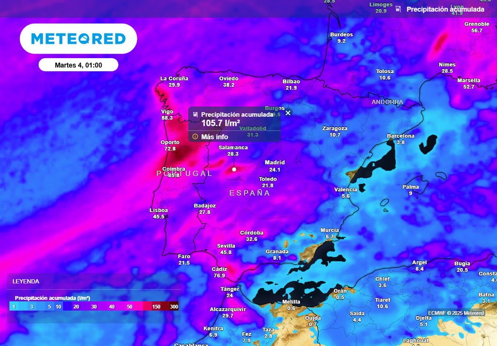 El viernes, un frente frío muy activo entrará por el oeste peninsular. Las comunidades donde más lloverá serán aquellas que limiten con Portugal: podrían caer 30-50 l/m2 en el sur de Galicia, extremo occidental de Castilla y León y nuevamente en el Sistema Central. La AEMET mantiene de momento los mismos avisos que el jueves en Galicia, con acumulados que nuevamente superarían los 40 l/m2 en 12 horas.
