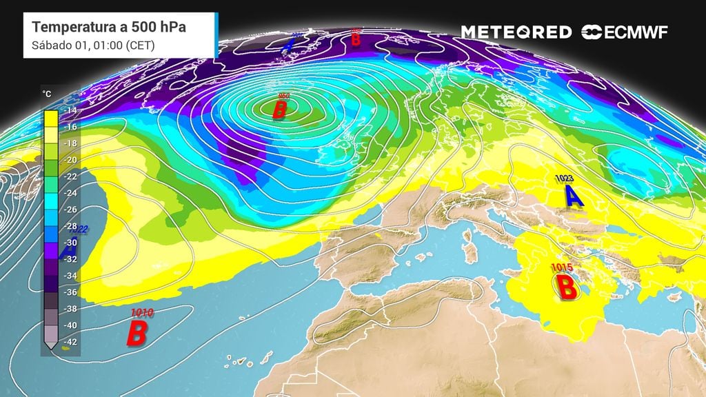 Se mantendrá la circulación atlántica en lo que queda de semana, destacando la gran borrasca que se situará entre Islandia y las islas británicas en los próximos días. Las masas de aire frías seguirán sin descolgarse hacia España.