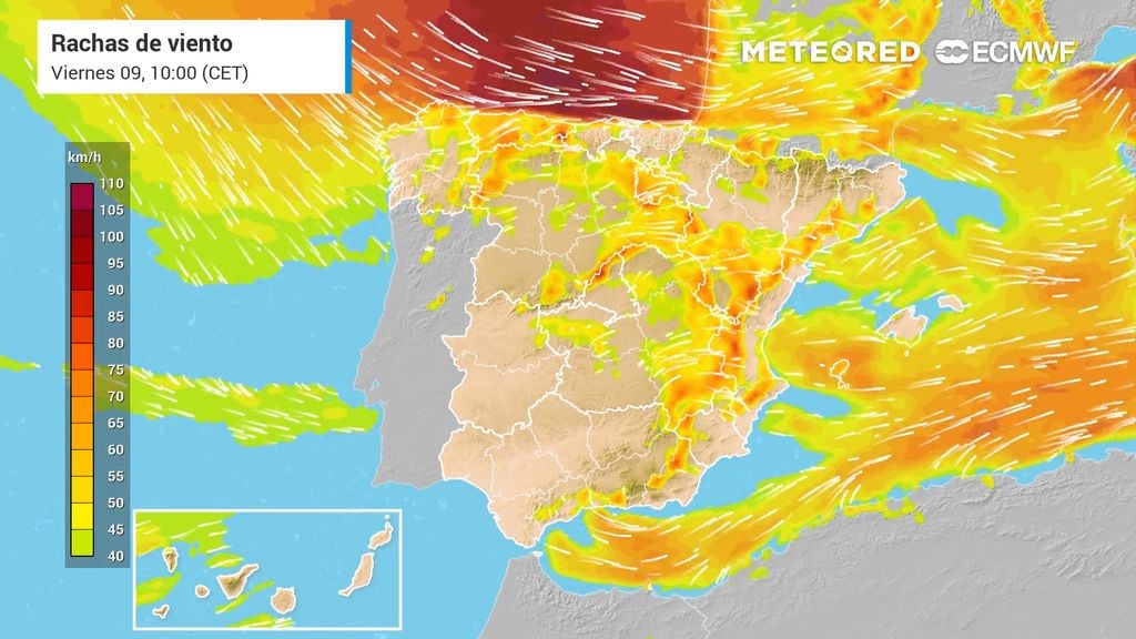 La cota de nieve tenderá a ir subiendo con la llegada del frente atlántico, de 500-600 metros al entorno de los 1000-1200 m, pudiendo nevar localmente a 300-500 en el centro-norte peninsular, y dejando acumulados significativos en el Pirineo, posibles en la Cordillera Cantábrica. En Canarias se esperan precipitaciones débiles en el norte de las islas montañosas, con rachas muy fuertes de alisio.