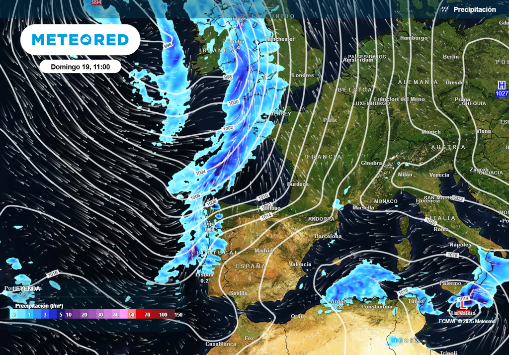 Como es habitual en estas situaciones, Galicia será la comunidad más afectada por las lluvias desde el domingo. Con el previsible paso de varios frentes, a lo largo de la semana que viene podrían caer más de 100 l/m² en puntos del oeste. Además, las precipitaciones podrían ser localmente intensas y tormentosas si se mantiene el actual escenario.