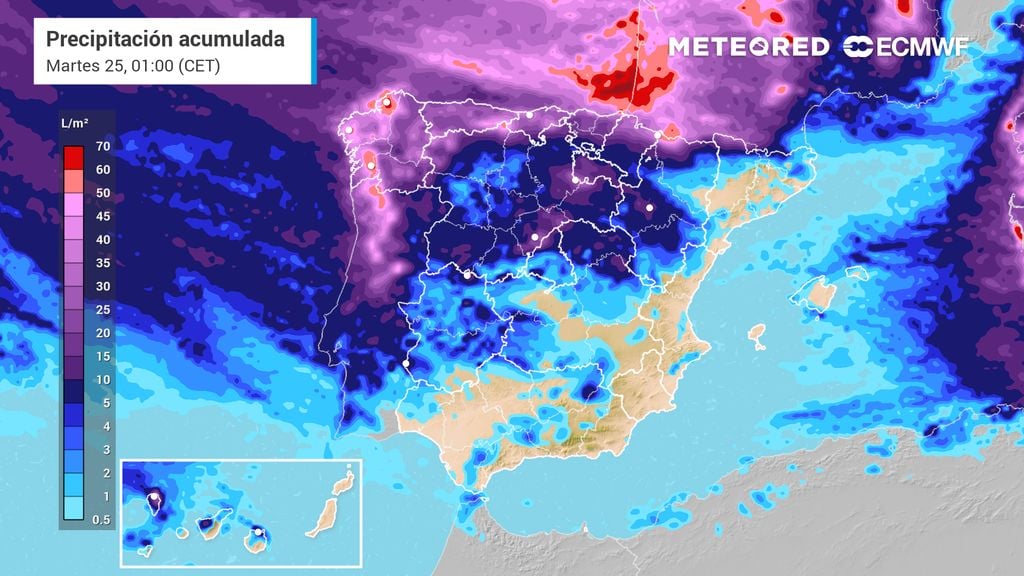 Más allá de Galicia y la vertiente cantábrica, el frente será poco activo en cuanto a precipitaciones se refiere. Se prevén algunas lluvias en la meseta norte, con acumulados inferiores a los 5 l/m2, excepto por Segovia, Soria y Burgos donde podría llover algo más.