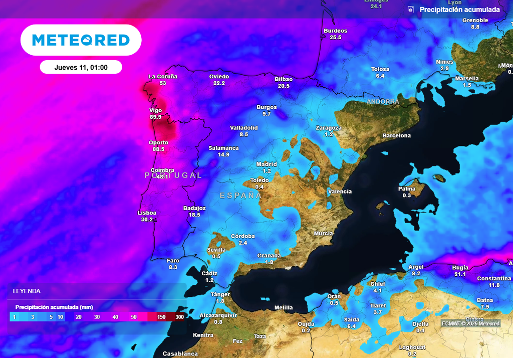 Con esta situación, las lluvias afectarán especialmente a la vertiente atlántica peninsular, con acumulados significativos en Galicia, sur del Sistema Central occidental y otras zonas montañosas del oeste peninsular. El viento también soplará fuerte, con un repunte importante en el cuadrante noroeste peninsular durante el lunes y el martes. También será destacable el fuerte oleaje que llegará a las costas atlánticas durante toda la próxima semana, impulsado por estas grandes borrascas.