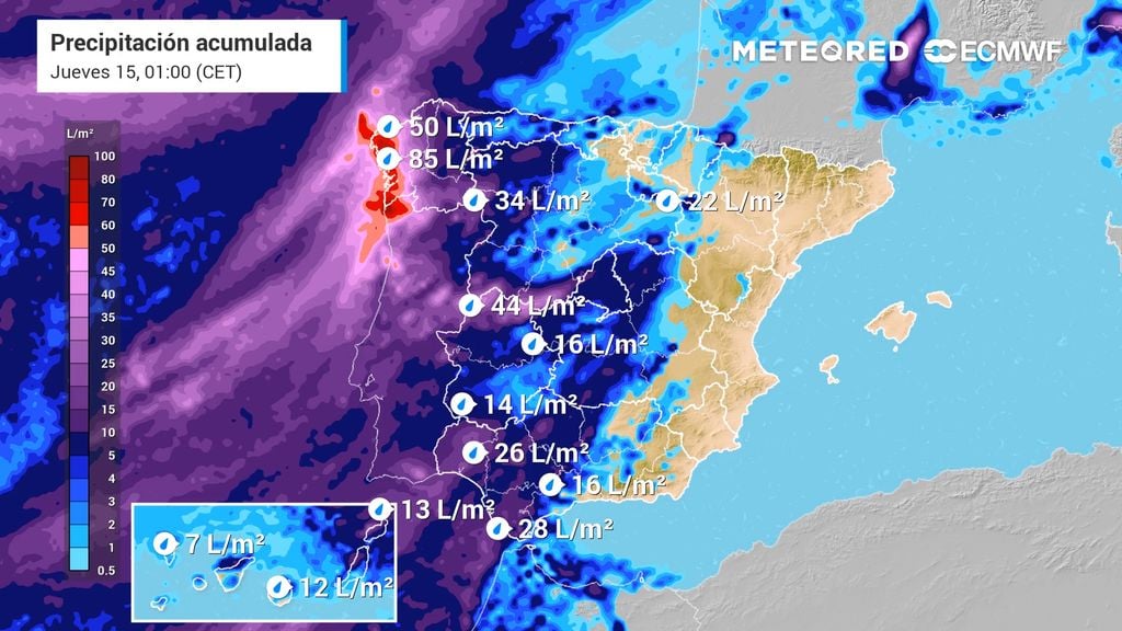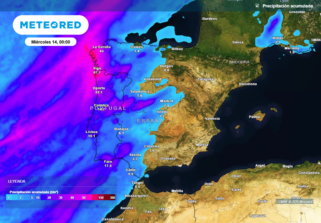 Las precipitaciones afectarán sobre todo al oeste peninsular y a Canarias, donde serán localmente intensas e irán acompañadas de algunas tormentas ocasionales. En puntos bien expuestos de la vertiente atlántica pueden acumularse hasta 100 l/m², e incluso más, entre hoy y mañana.