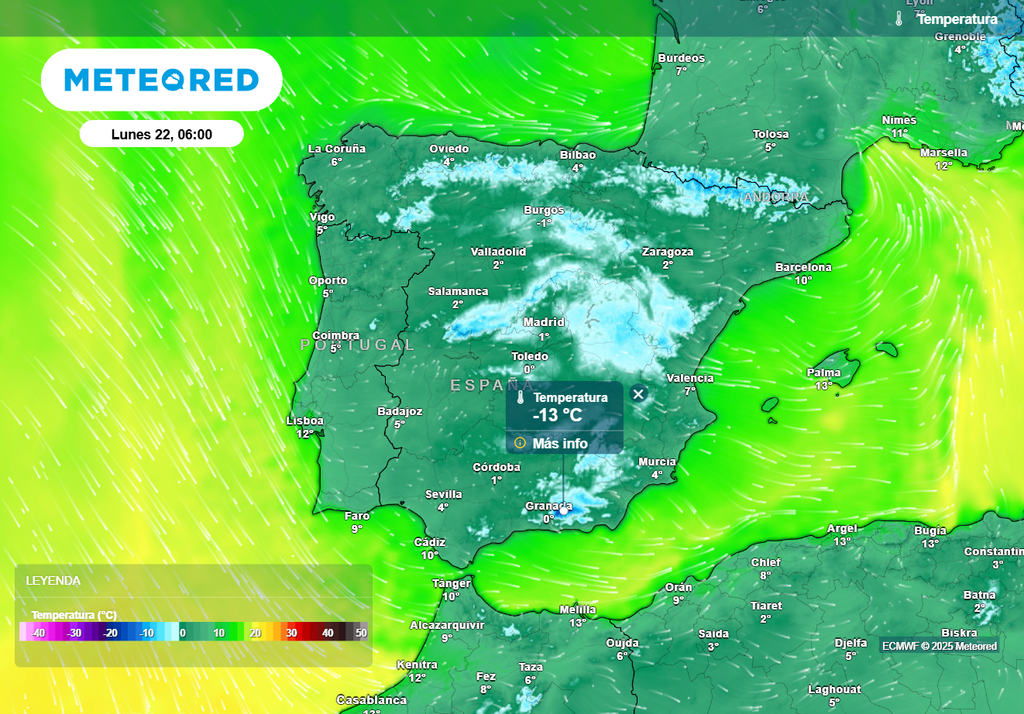 En puntos del Pirineo, Sistema Central, Sierra Nevada y sectores propicios a la inversión las mínimas pueden desplomarse hasta por debajo de los -10 ºC, según el modelo europeo. Se quedarán en unos -5 ºC en zonas del Sistema Ibérico, especialmente en Soria y áreas del interior de Teruel, así como en puntos elevados del nordeste.