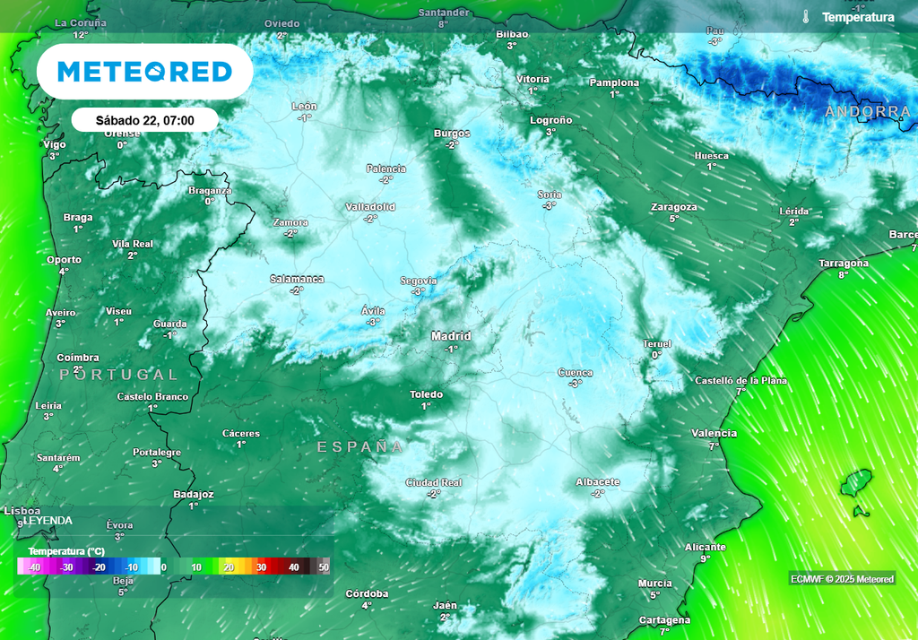 La advección de aire ártico dejará estampas blancas en amplias zonas de la España peninsular, y no será por la nieve. Se prevén mínimas por debajo de los -4 ºC en estas dos capitales.