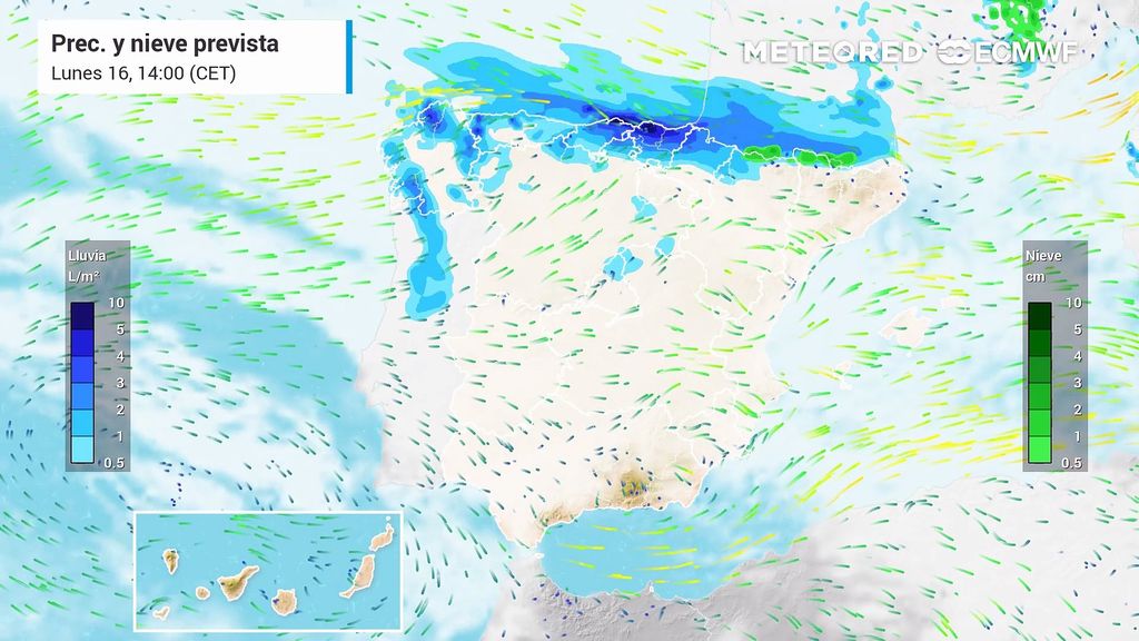 Las precipitaciones se concentrarán este 16 de febrero al extremo septentrional peninsular. Donde desde esta madrugada ya se han extendido por todo el litoral Cantábrico y Galicia, especialmente a A Coruña y Pontevedra, con lluvias que irán ganando extensión e intensidad a lo largo de la mañana.