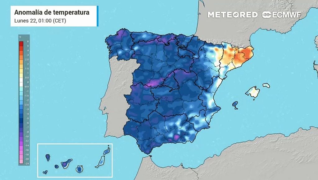 En las horas centrales, las temperaturas quedarán muy por debajo de las registradas ayer, con una bajada generalizada de entre 6 y 10 ºC. Los descensos más acusados se producirán en el norte y el interior peninsular, especialmente en la meseta norte, el Sistema Ibérico, el Sistema Central y el interior cantábrico, donde el ambiente será plenamente invernal.