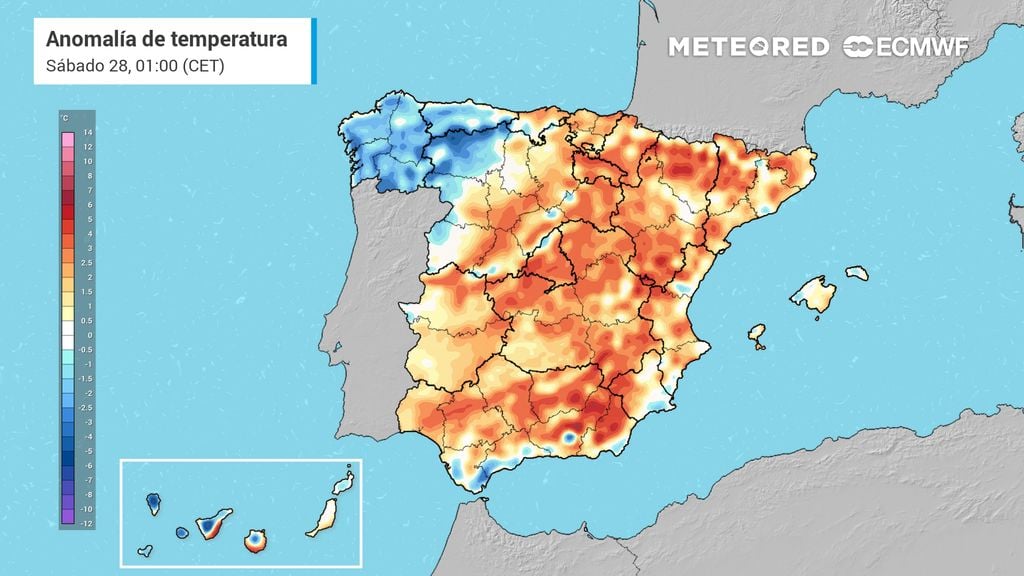 La bajada se extenderá en menor medida por el resto de la meseta norte, Extremadura, Comunidad de Madrid, Castilla La Mancha y la costa del País Vasco. En el área mediterránea, valle del Guadalquivir, Aragón y Navarra los valores diurnos no experimentarán cambios relevantes.