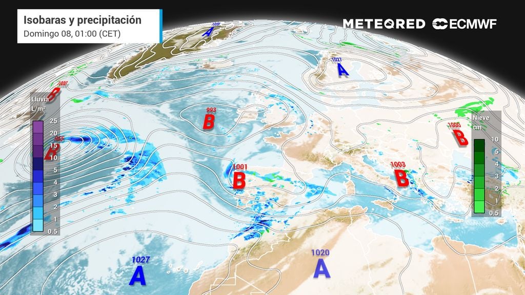 En la jornada del domingo los frentes que puedan cruzar la Península serán débiles, al tiempo que tenderá a acercarse otro asociado a una nueva borrasca atlántica que no parece que vaya a ser tan profunda como la anterior, por lo que previsiblemente las precipitaciones serán menos abundantes. Seguirá nevando en las cordilleras y también puede hacerlo en algunas comarcas de la meseta superior.
