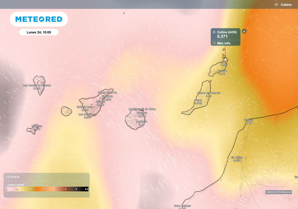 Los vientos del este-sureste en capas medias están arrastrando altas concentraciones de polvo en suspensión hacia el archipiélago canario, donde permanecen activos los avisos en toda la provincia de Las Palmas y en la isla de Tenerife.