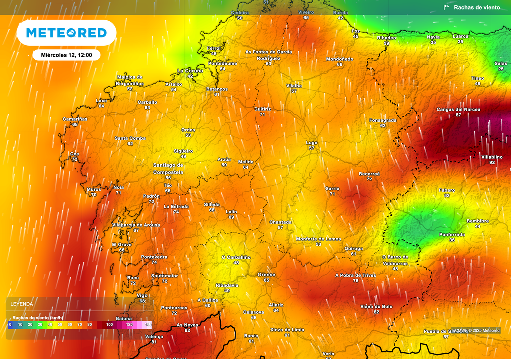 De forma local podrían superarse los 90 km/h en el litoral de Pontevedra y áreas de montaña. Esto lo corroboran los datos de la AEMET registrados hasta el momento: las rachas ascienden a 94 km/h en Fisterra y 96 km/h en Chandrexa de Queixa, Ourense.