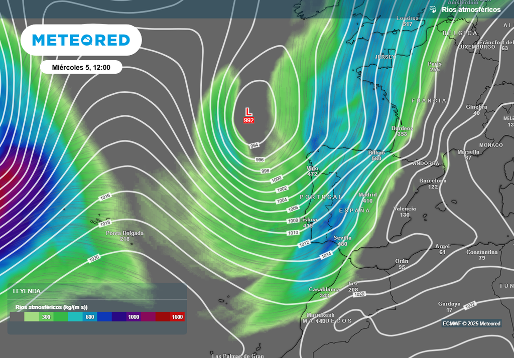 La borrasca situada frente al noroeste impulsará una masa de aire muy húmeda hacia la España peninsular.