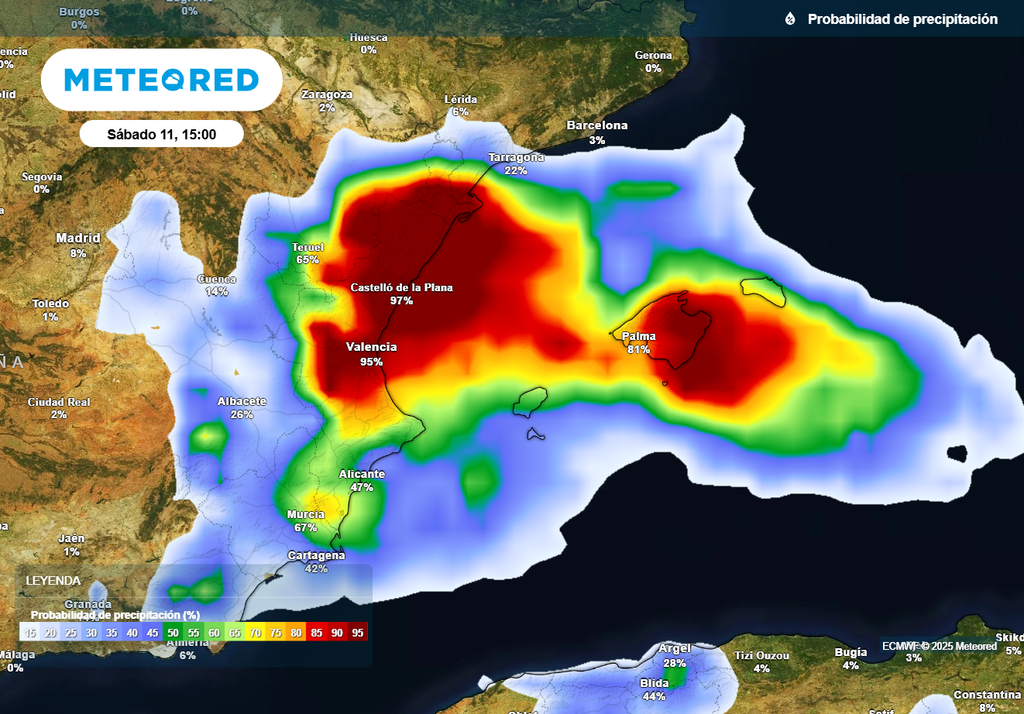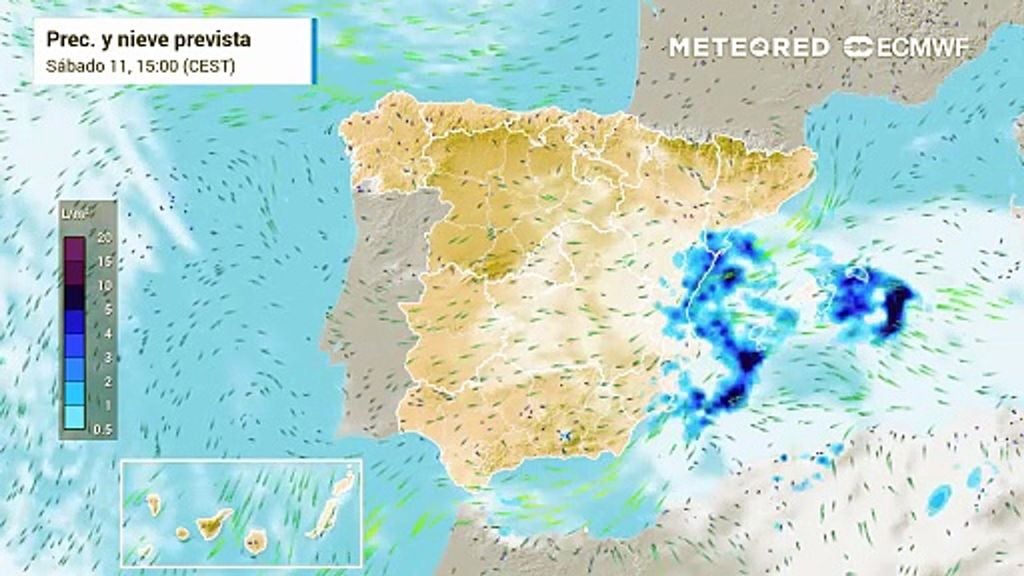 En el caso de Baleares, encabeza Sant Antoni de Portmany, Ibiza, con más de 61 l/m2 recogidos desde la medianoche hasta las 10:30 h. De momento, los fenómenos más adversos son los aguaceros estáticos que pueden descargar grandes cantidades de precipitación sobre las mismas zonas.