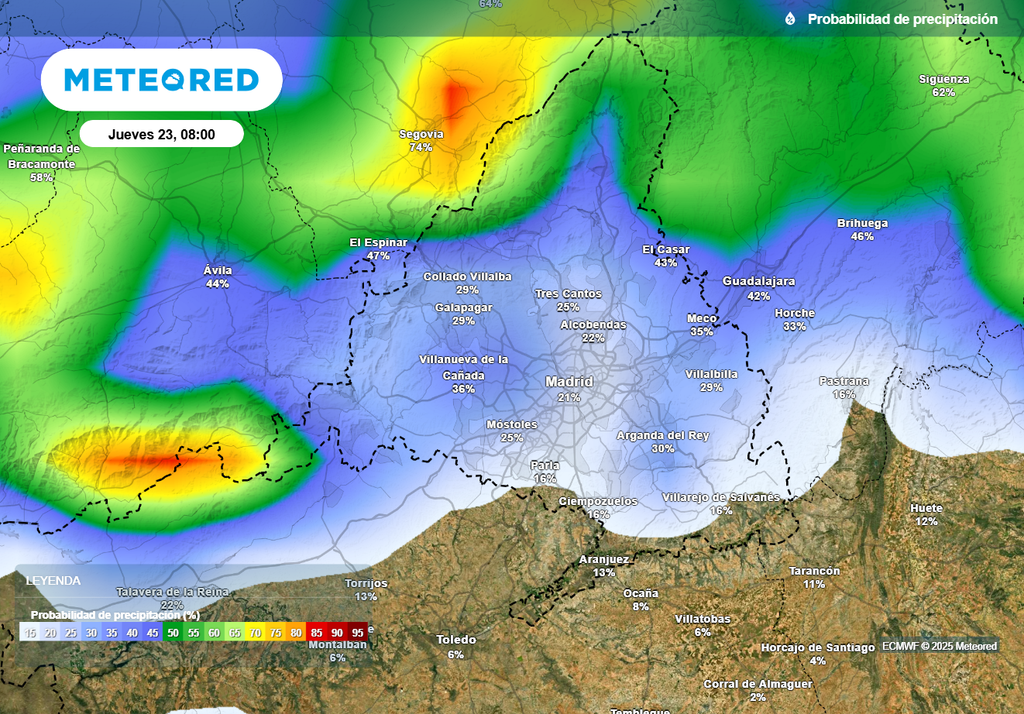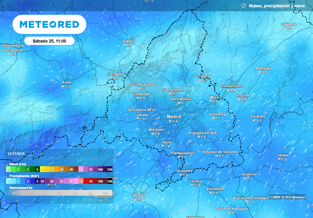 Esta configuración inyectará humedad a las condiciones iniciales y favorecerá la formación de chubascos y algunas tormentas en la jornada del sábado en la Comunidad de Madrid, que aún con cierta incertidumbre, podría ser el día más lluvioso de la semana.