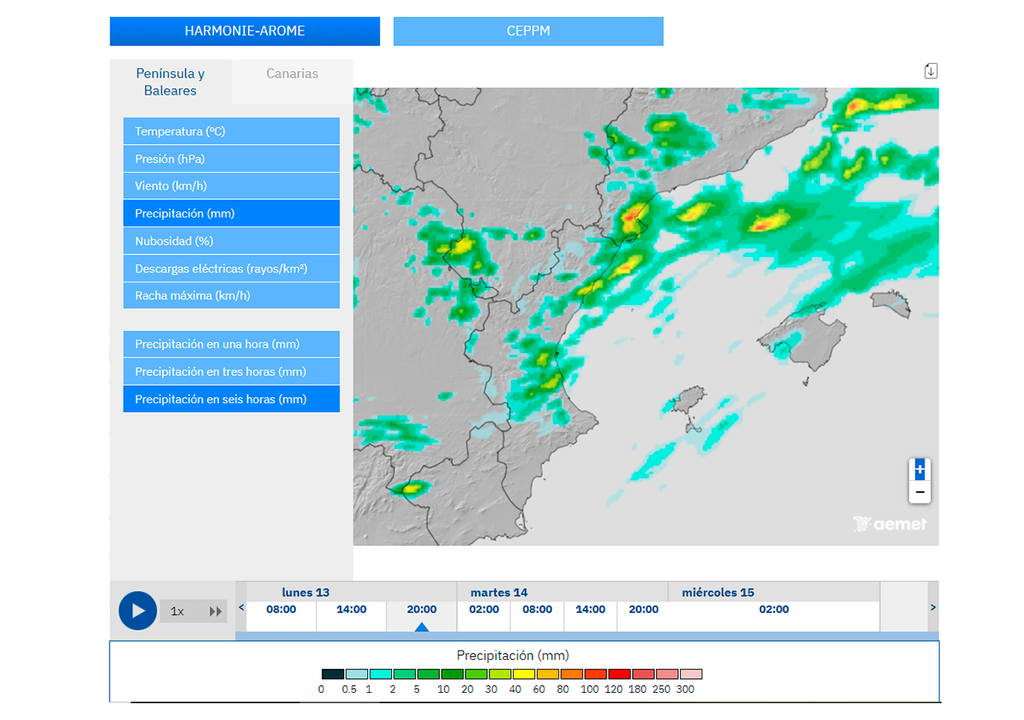 Al caer la noche remitirán las lluvias en tierra firme, pero se intensificarán sobre el mar Balear. Por ello, no habrá que perder de vista el litoral de las provincias de Valencia y Alicante, así como Baleares en la noche de hoy al martes.