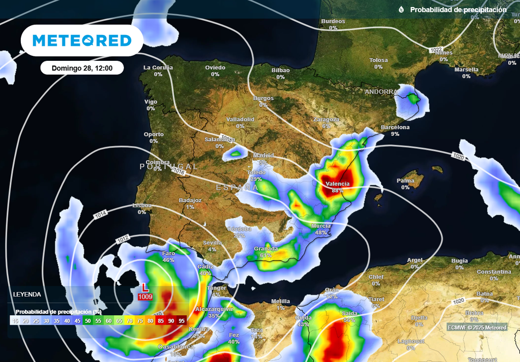 El este-sureste peninsular quedará bajo el sector de divergencia en altura del embolsamiento de aire frío, la zona más inestable del mismo, a lo que hay que sumar un flujo húmedo de levante. Los aguaceros irán trasladándose hacia Granada y Almería, donde serán fuertes e irán acompañados de tormenta. En la costa granadina y en la demarcación almeriense del valle de Almanzora-Los Vélez hay avisos naranjas en vigor por acumulados de más de 80 l/m² en 12 horas.