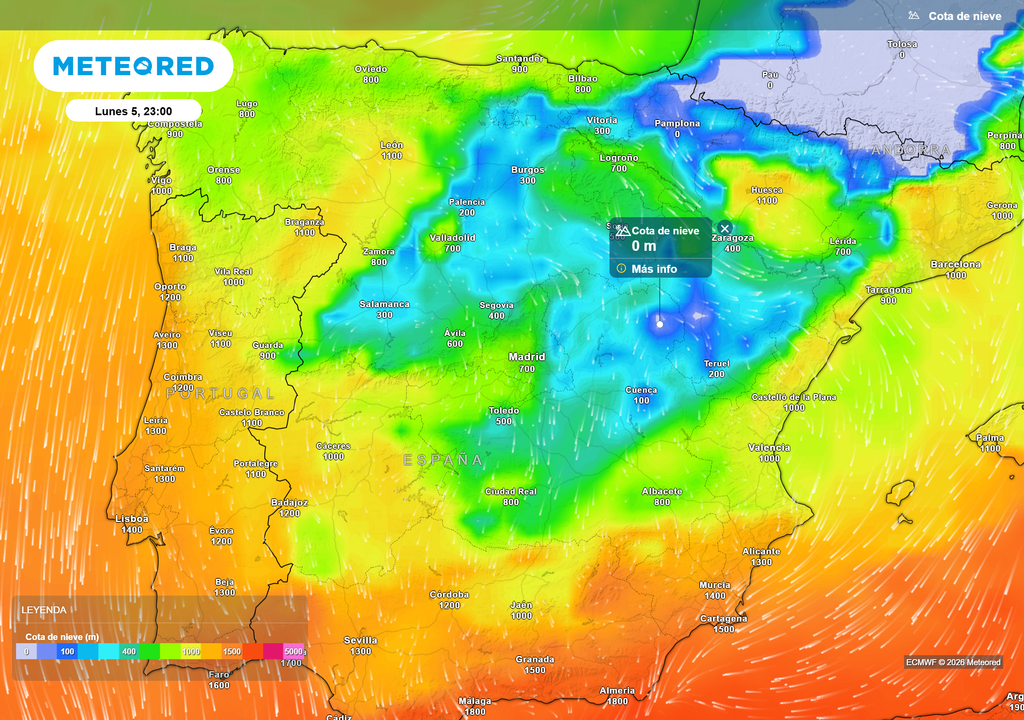 Desde las primeras horas del día, las nevadas ya se encuentran bajo aviso en amplias zonas del centro y noreste peninsular. En la Serranía de Guadalajara, las Parameras de Molina, la Sierra de Madrid, la Alcarria de Guadalajara y la Alcarria conquense, se esperan acumulaciones que superarán los 2 y 5 cm en 24 horas, con una cota inicialmente en torno a 800-900 metros, aunque durante la madrugada la nieve ha aparecido a cualquier cota.