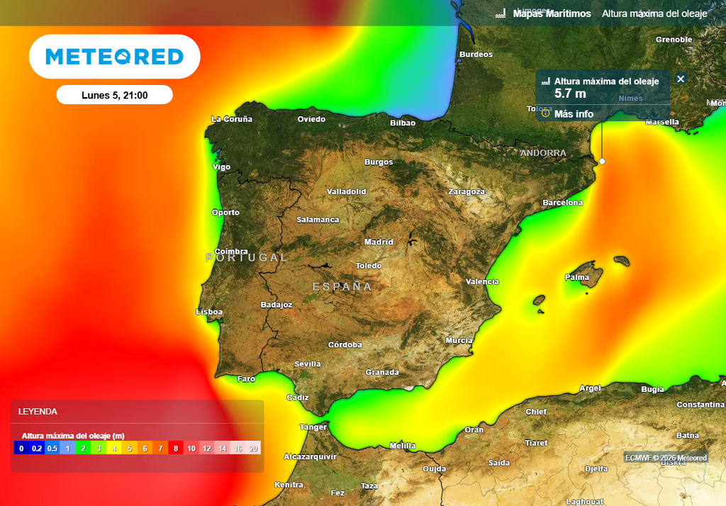 La situación marítima estará alterada en el noreste catalán, con aviso naranja por fenómenos costeros en el Ampurdán por olas de más de 6-7 metros. También hay avisos vigentes de nivel amarillo por este motivo en Alicante, Región de Murcia, Baleares, Galicia y occidente asturiano. En Canarias se ha activado el avisos amarillo en el norte de Gran Canaria por acumulados de más de 40 l/m² en 12 horas.