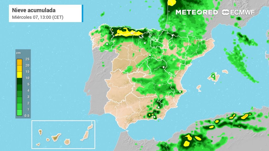 En Asturias, las nevadas alcanzarán al suroccidente, la Cordillera y Picos de Europa, con espesores de más de 5 cm, esperándose la nieve en cotas relativamente bajas, en torno a 600-700 metros.