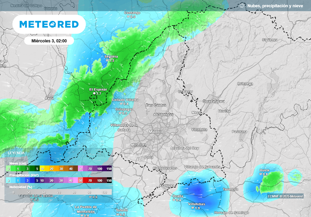 En estas situaciones, cuando una masa de aire húmedo llega al entorno de la sierra de Guadarrama, se ve obligada a ascender. Ello provoca un enfriamiento rápido del aire, la condensación de la humedad y, finalmente, la precipitación. Este proceso orográfico puede intensificar o reactivar las precipitaciones, incluso aunque el frente original llegue debilitado.