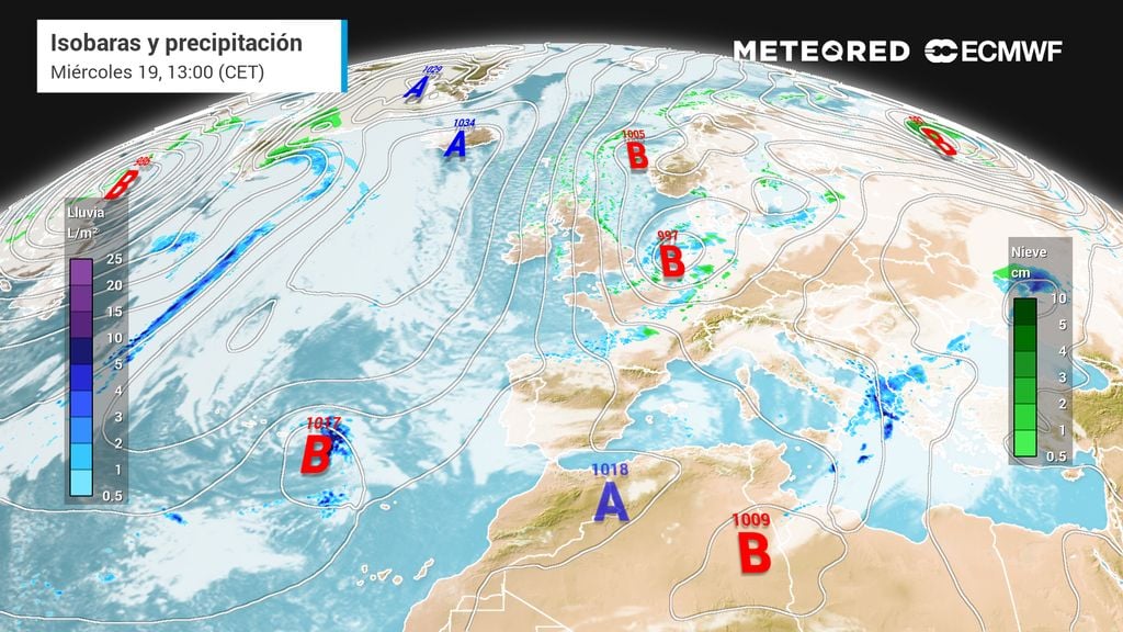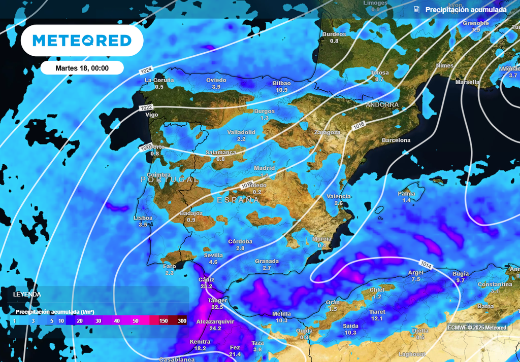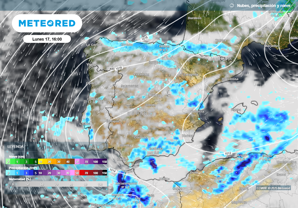 De cara al martes se prevé que los cielos cubiertos se vayan despejando y que cesen las precipitaciones. Tras este episodio de lluvias y ambiente templado llegará un cambio de tiempo radical que ya adelantamos en Meteored la semana pasada, con la llegada de una masa de aire ártica que traerá un ambiente invernal.