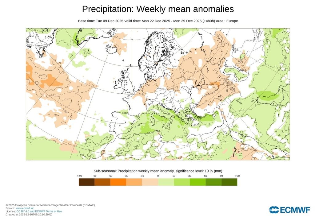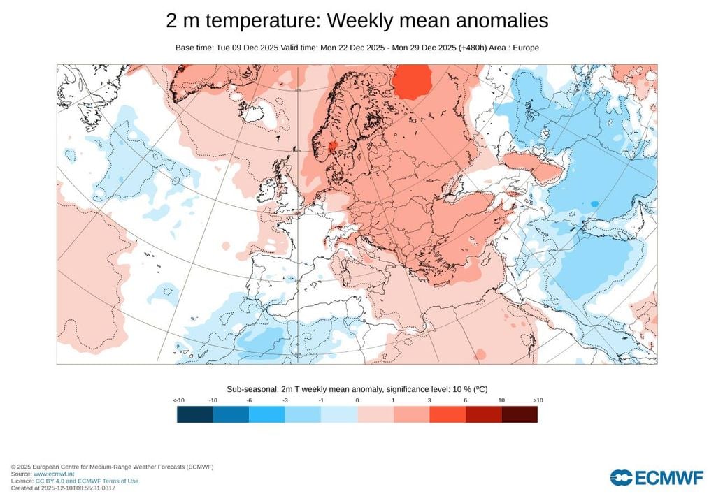 De momento, no parece que este escenario se vaya a cumplir, al menos no lo refleja así el modelo europeo en su mapa semanal de anomalías. En Navidad, el modelo prevé anomalías positivas en gran parte de Europa central y septentrional, indicando que en estas zonas dominará el anticiclón. Las anomalías negativas quedarían concentradas en forma de una burbuja sobre la Península y Baleares, y podrían deberse a la formación de una DANA o BFA al norte de África.