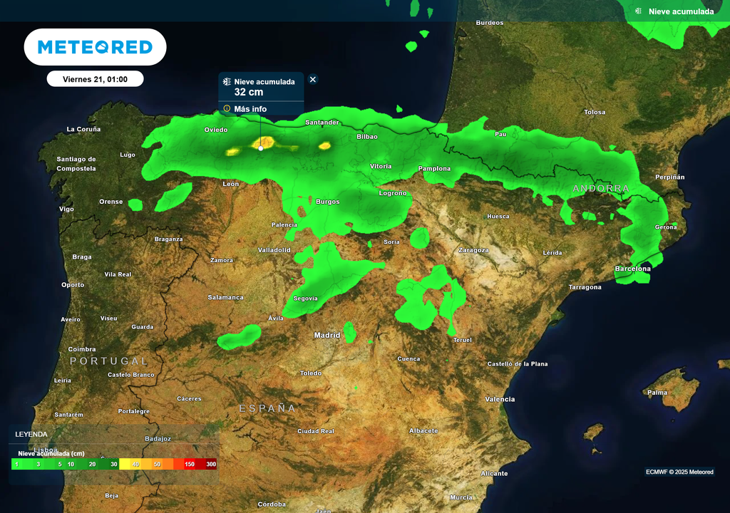Hasta finales de semana, los acumulados podrían situarse en torno a 5 cm en el Sistema Central e Ibérico norte; 5–10 cm en el este de la meseta norte y el interior del noreste de Cataluña; 10–15 cm en Asturias, Cantabria, País Vasco, La Rioja y Navarra; y por encima de 20–30 cm en Pirineos y la Cordillera Cantábrica.