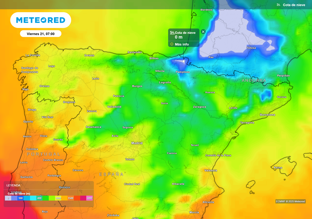 Este patrón favorecería nevadas generalizadas en los sistemas montañosos del norte y noreste. Durante la mañana del jueves la cota comenzaría entre los 1200 y 1500 metros, pero iría descendiendo con rapidez hasta situarse en torno a 600 y 700 metros en el noreste de la meseta sur y en amplias zonas de la mitad norte.