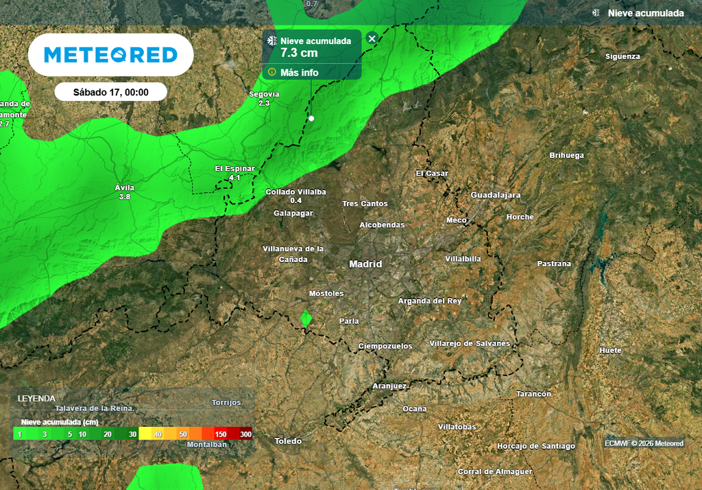 Al final del día, la nieve podría situarse por debajo de los 1.200 metros, afectando a amplias zonas del Sistema Central. La Sierra de Guadarrama será una de las áreas más beneficiadas, con los primeros acumulados apreciables en puertos y cotas medias-altas.