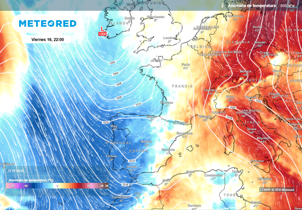 El origen de este episodio se sitúa en la profundización de una potente borrasca al sur de Groenlandia, una región clave en la dinámica atmosférica del Hemisferio Norte. Este sistema de bajas presiones presenta un gran recorrido y una elevada energía, factores que potencian su influencia aguas abajo.