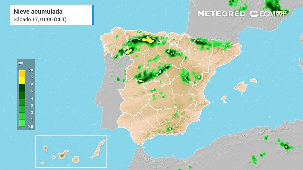 En la segunda mitad del día, la entrada de una nueva vaguada y del seno de la masa de aire aún más fría podría provocar un nuevo descenso de la cota, que a últimas horas del día o durante la madrugada del viernes al sábado podría bajar de los 900-1.000 metros, e incluso alcanzar localmente los 800 metros.