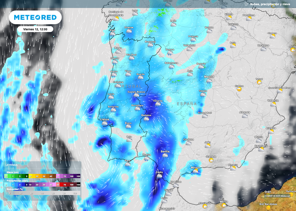 El viernes, el nuevo frente empezará a cruzar la Península, dejando precipitaciones abundantes en la mitad occidental. Se producirán nevadas en los Montes de Toledo y en el Sistema Central, con la cota de nieve situada entre los 1200 y los 1400 m en el noroeste peninsular y entre los 1500 a 1800 m en la zona centro.