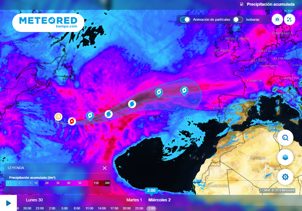 Lo más probable es que la borrasca pierda sus características tropicales al encontrarse con aguas más frías en el Atlántico norte y una mayor cizalladura. De llegar a las costas europeas, probablemente lo haría como una borrasca extratropical, es decir, una depresión típica de latitudes medias, como muchas otras que tenemos en invierno.
