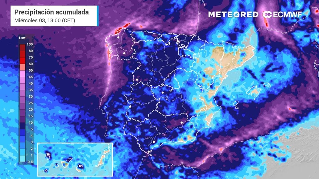El segundo frente llegará en la madrugada del miércoles, cuando volverán a intensificarse las lluvias. No obstante, se retirará por el este en las primeras horas del día. Se espera una jornada con intervalos nubosos y algún chubasco residual.