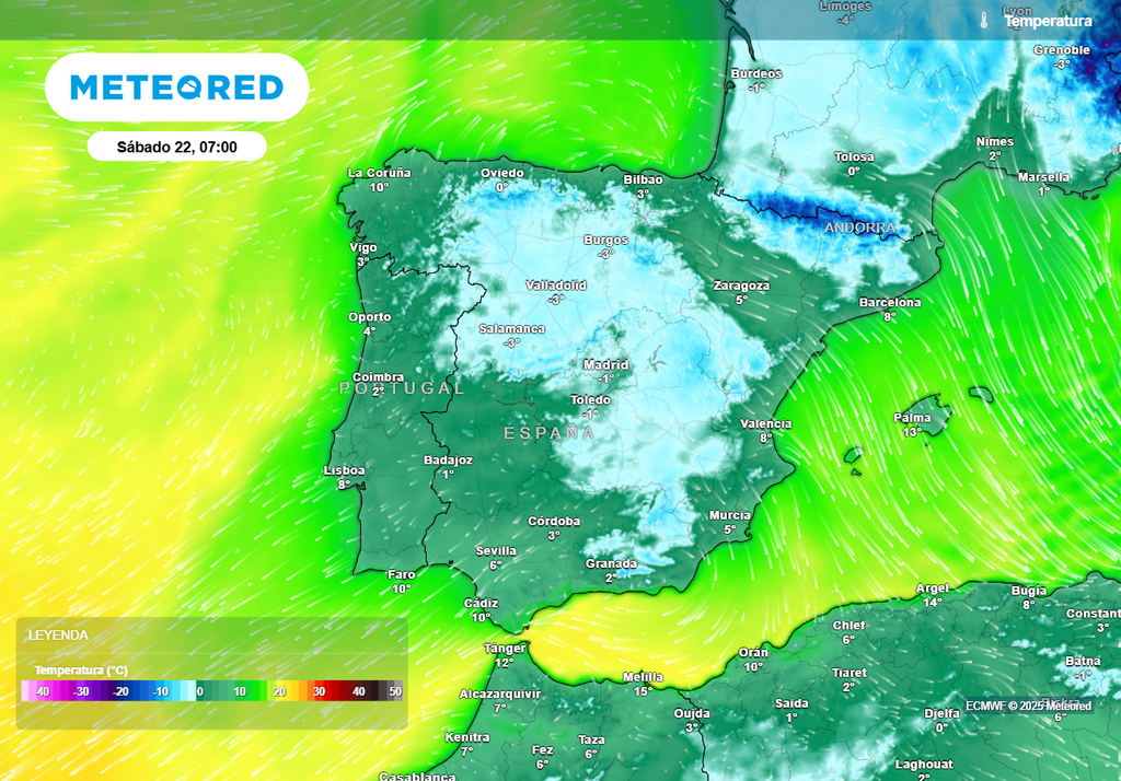 Mañana al amanecer las temperaturas mínimas se desplomarán al calmar el viento en buena parte del interior de la península, extendiéndose las heladas por amplias zonas, a excepción tan sólo de zonas bajas del oeste de Andalucía, Extremadura y Valle del Ebro. Las heladas serán intensas y extensas en amplias zonas, más fuertes en las cordilleras, especialmente en el Pirineo, bajando de los -10 ºC.