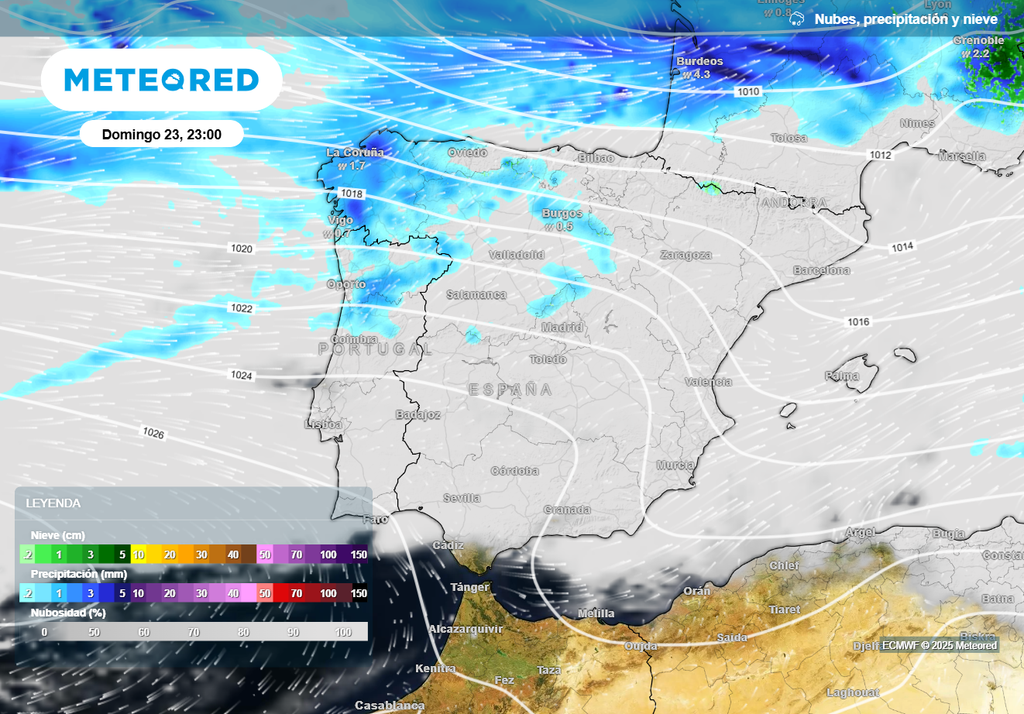 Una borrasca situada al norte de la península y el anticiclón al suroeste, propiciarán una intensa circulación atlántica el domingo. Predominarán los cielos nubosos en la península y Baleares, con precipitaciones en el extremo norte, persistentes en el Cantábrico oriental, Pirineo occidental y Galicia, donde serán localmente fuertes en las comarcas del oeste.