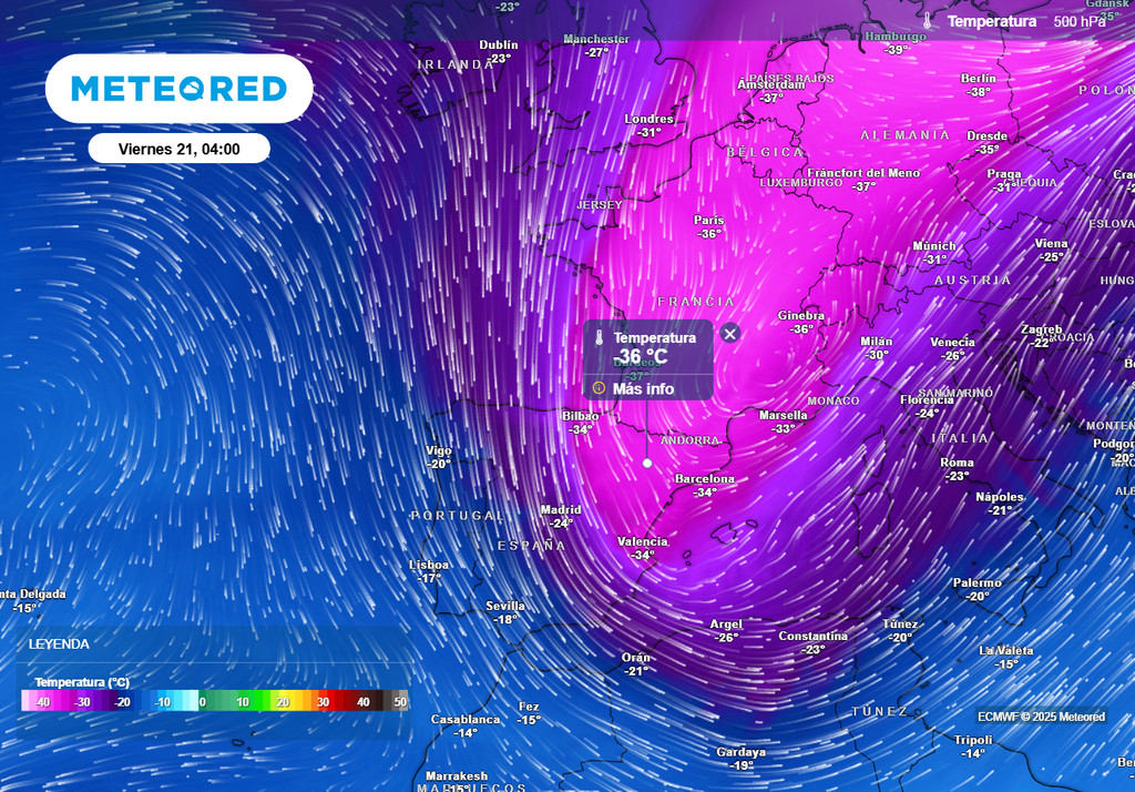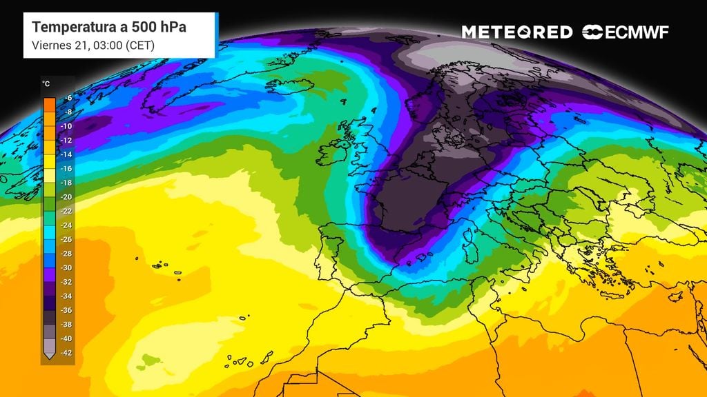 Como ya explicamos en Meteored, esta irrupción de aire frío será muy contundente para la época. Las últimas actualizaciones del modelo europeo contemplan que hacia el viernes, probablemente el día más frío del episodio, la isoterma de -4 ºC a unos 1500 metros puede abrazar el noreste y el Cantábrico oriental, alcanzando la -6 ºC incluso al Pirineo. A unos 5500 metros, la isoterma de -36 ºC puede llegar al norte.