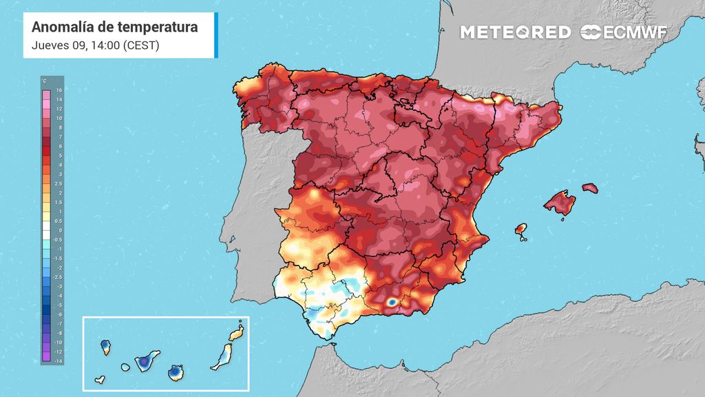 Esta configuración favorece la advección de una masa de aire muy cálido procedente del norte de África, claramente visible en los mapas en altura, donde las temperaturas son inusualmente elevadas para la época.