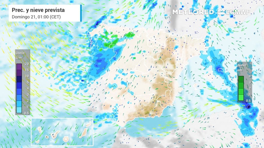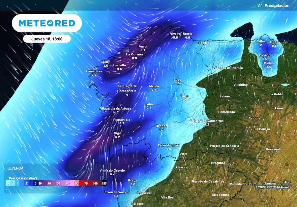 De forma paralela, al acabar el día las precipitaciones ya habrán regado toda Galicia y dejarán acumulados superiores a los 50 l/m2 en el oeste de A Coruña. En otros puntos de la región, cerrarán la jornada con los pluviómetros marcando más de 40 l/m2 en amplias zonas de la provincia de Pontevedra.