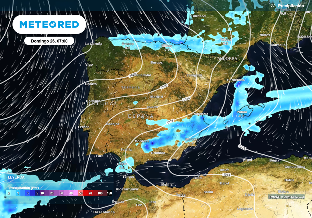 El cambio de tiempo ya se refleja en el mapa semanal de anomalía de precipitación del modelo europeo. Las anomalías positivas serán destacables en Galicia y la vertiente cantábrica, apareciendo ya una señal de lluvias sobre Baleares y el litoral catalán. Según los últimos mapas de Meteored, el Pirineo oriental, oeste de A Coruña, Pontevedra y la sierra de Gredos podrían cerrar la semana con acumulados de 100 a 150 l/m², localmente más.