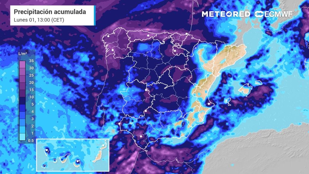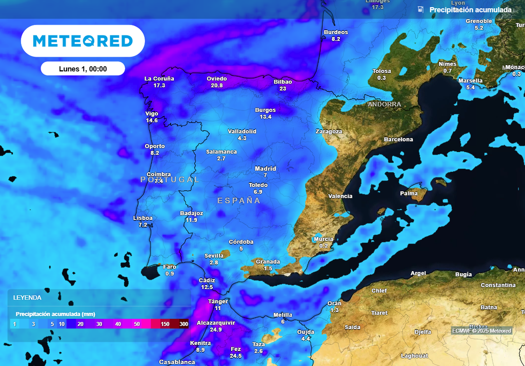 En el transcurso de la jornada, donde más lloverá será en el norte de Galicia, vertiente cantábrica y litoral gaditano. El modelo europeo prevé acumulados de 25 a 30 l/m2 al norte de A Coruña, Asturias, Cantabria y País Vasco. Localmente podrían registrarse más de 30 a 35 l/m2 en el litoral del País Vasco, debido al flujo de vientos del norte con recorrido marítimo en el mar Cantábrico.