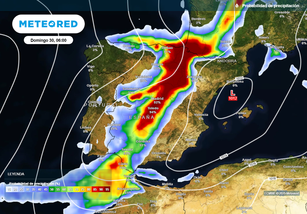 Durante la madrugada y primeras horas de mañana domingo, las lluvias asociadas al frente regarán el interior peninsular, vertiente cantábrica, norte de Extremadura, La Rioja y sur de Aragón. Durante la tarde se reactivarán en Andalucía, con chubascos localmente fuertes y tormentosos, especialmente en la costa. Al caer la noche podrían llegar chubascos fuertes con tormenta a puntos de Mallorca y Menorca.