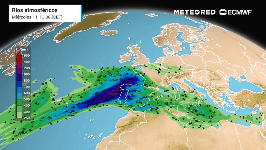 Mañana el río atmosférico incidirá sobre la Península Ibérica, intensificándose las precipitaciones en Galicia, oeste y sur de Castilla y León, norte de Extremadura, vertiente cantábrica, puntos de la Ibérica, Navarra, Pirineo y depresiones del noroeste. También se reactivarán en áreas montañosas, siendo menos probables en algunas comarcas andaluzas, amplias zonas del litoral mediterráneo y sectores del valle del Ebro.
