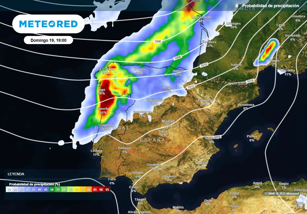 El domingo frente irá avanzando de oeste a este, repartiendo precipitaciones en la mayor parte de la mitad noroeste peninsular. Serán más abundantes y con tormentas ocasionales en Galicia y Asturias, especialmente en las comarcas del oeste gallego donde podrán ser persistentes y localmente fuertes. Por allí la inestabilidad será más acusada durante la madrugada y la mañana.