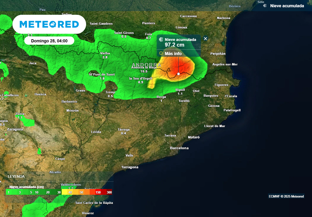 De nuevo, el modelo europeo contempla cantidades de nieve que podrían rondar los 20 - 40 cm de espesor a partir de una cota de nieve de 1800 m en el prepirineo de Barcelona, Pirineo de Girona y la zona más oriental del Pirineo de Lleida. Aun así, modelos locales como el AROME ven la posibilidad de tener acumulados de nieve nueva de hasta 1 metro o más en zonas de alta montaña.